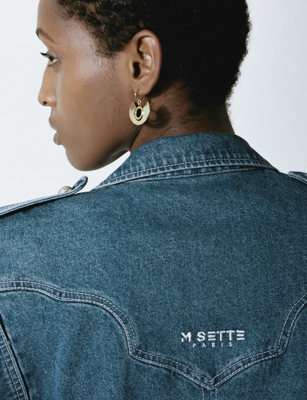 That classic, light blue denim of the ‘80s and ‘90s screams “I am fashion!” in this brilliantly feminine, button-down mini Jacket-Dress made from 100% organic cotton.